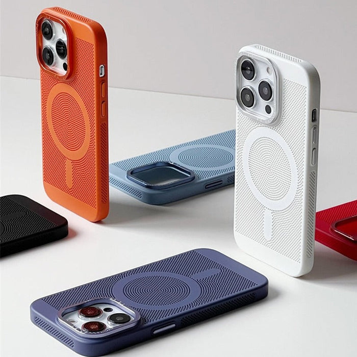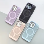 PC + metal material, non-toxic and odorless, has excellent wear resistance, not easy ageing, bright color characteristics, more than ordinary plastic has good protective and functional. Built-in Magsafe magnetic module, which can be delicately attached to each other through magnetism. The magnets are automatically aligned with the Magsafe charger, can be quickly and easily charged.It can fully protect the equipment from normal scratches, dirt, tearing and abrasion.All buttons and ports are accessible.Simple, comfortable, easy to carry. Grid design, with heat dissipation function.